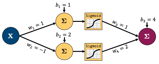 The equation for calculating the output of that network is below, it’s the linear layers and activation functions (Sigmoid in this case) recursively stuck together: